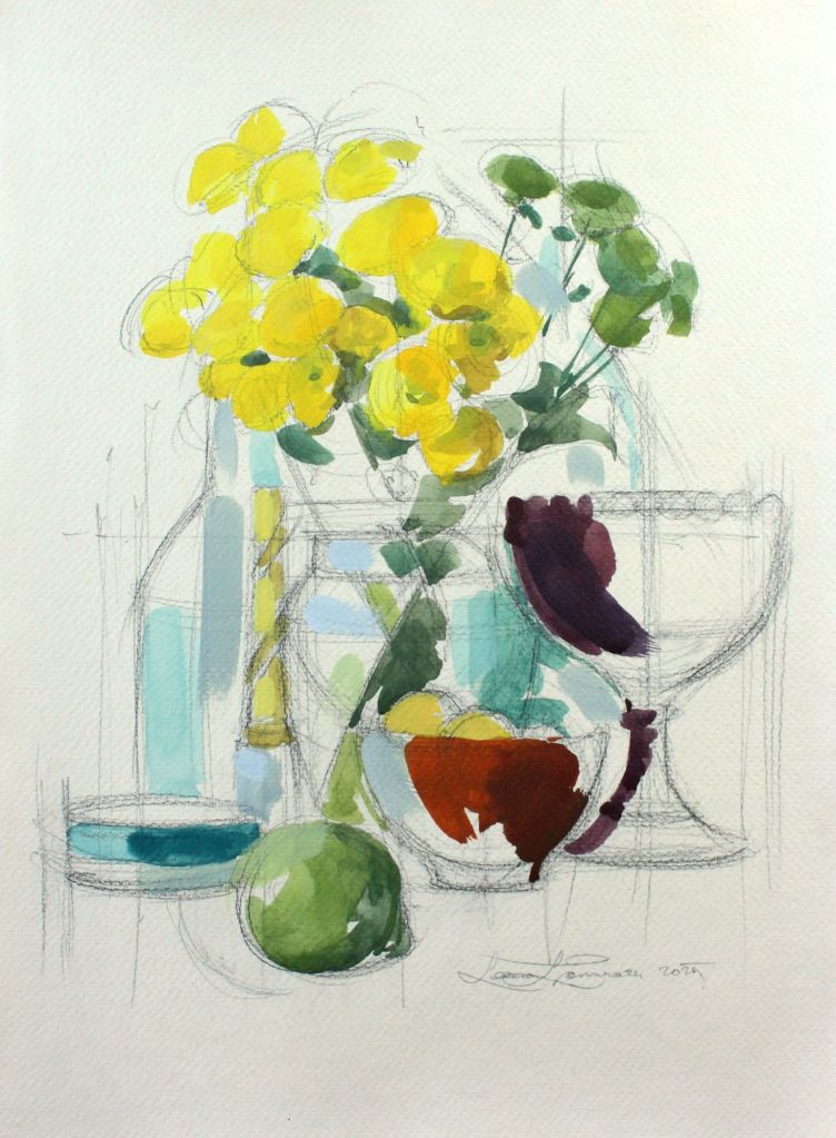 3. Sini-puna-kultainen asetelma II / Still Life in Blue, Red and Gold II. 26cm × 32cm. 120€
