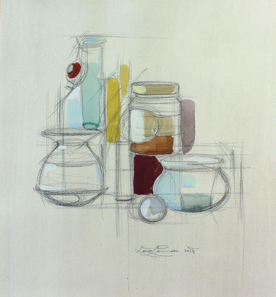 Lyijykynä ja guassimaali paperille. Pencil and gouache on paper.